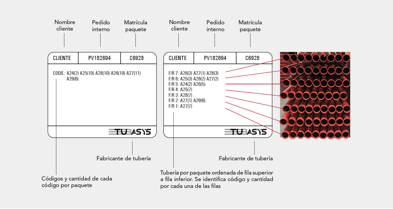 Los medios de transporte utilizados para los paquetes de tubería han de permitir la carga y descarga por la parte superior (Open Top) o por los laterales. Los paquetes de tubería deben viajar siempre cubiertos con toldo o bien en contenedor cerrado con lona superior o cubierta desmontable, sobre superficie plana y perfectamente amarrados con el empaquetado original de Tubasys.